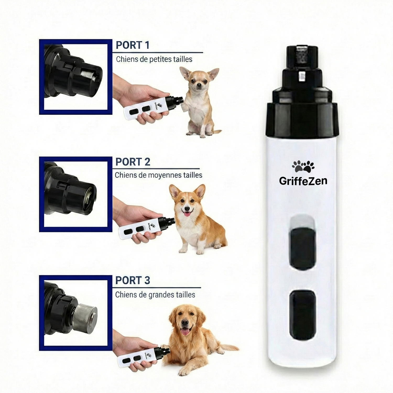 GriffeZen s'adapte à la morphologie de votre animal. Le capuchon de protection dispose de deux ouvertures (une étroite pour les chats ou chiots, une plus large pour les chiens moyens). Pour les très grandes races, vous pouvez retirer le capuchon et utiliser la tête de limage directement. Nous conseillons de toujours démarrer en vitesse 1 pour tester la réaction de votre compagnon.