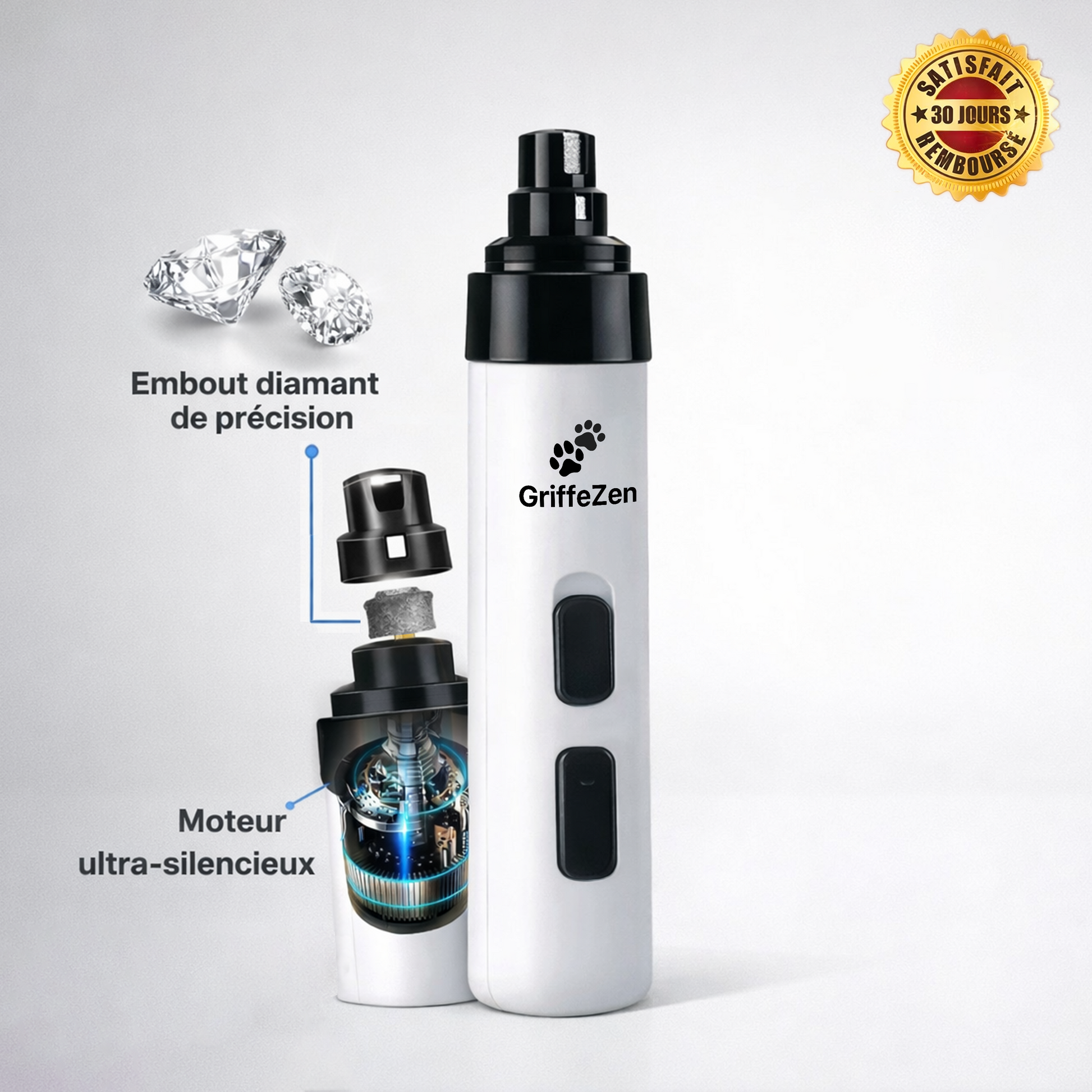 La plupart des ponceuses utilisent des moteurs bruyants qui effraient l'animal. GriffeZen utilise une technologie "Silence-Drive" à moins de 40 dB et une meule en diamant qui ne chauffe pas, garantissant un soin sans aucune douleur.