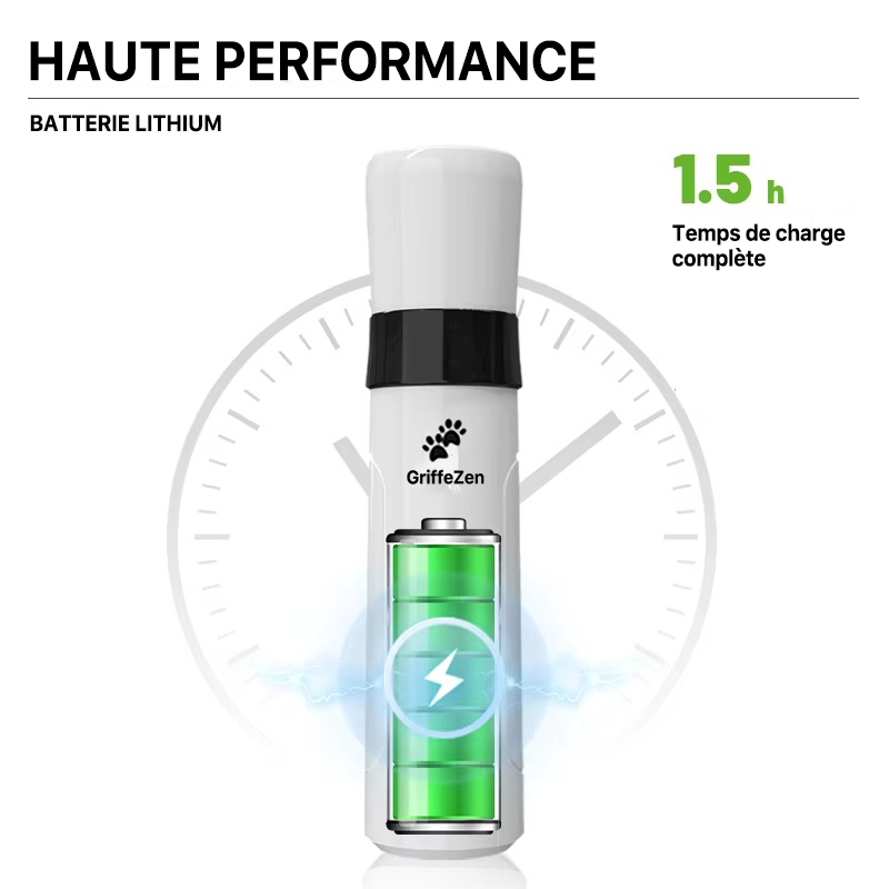 GriffeZen fonctionne sur une batterie interne haute performance. Il vous suffit de le brancher via le câble USB fourni. Une seule charge complète vous garantit de multiples séances de toilettage sans aucune baisse de puissance. C'est un choix à la fois écologique, économique, et l'assurance d'avoir un outil toujours opérationnel.